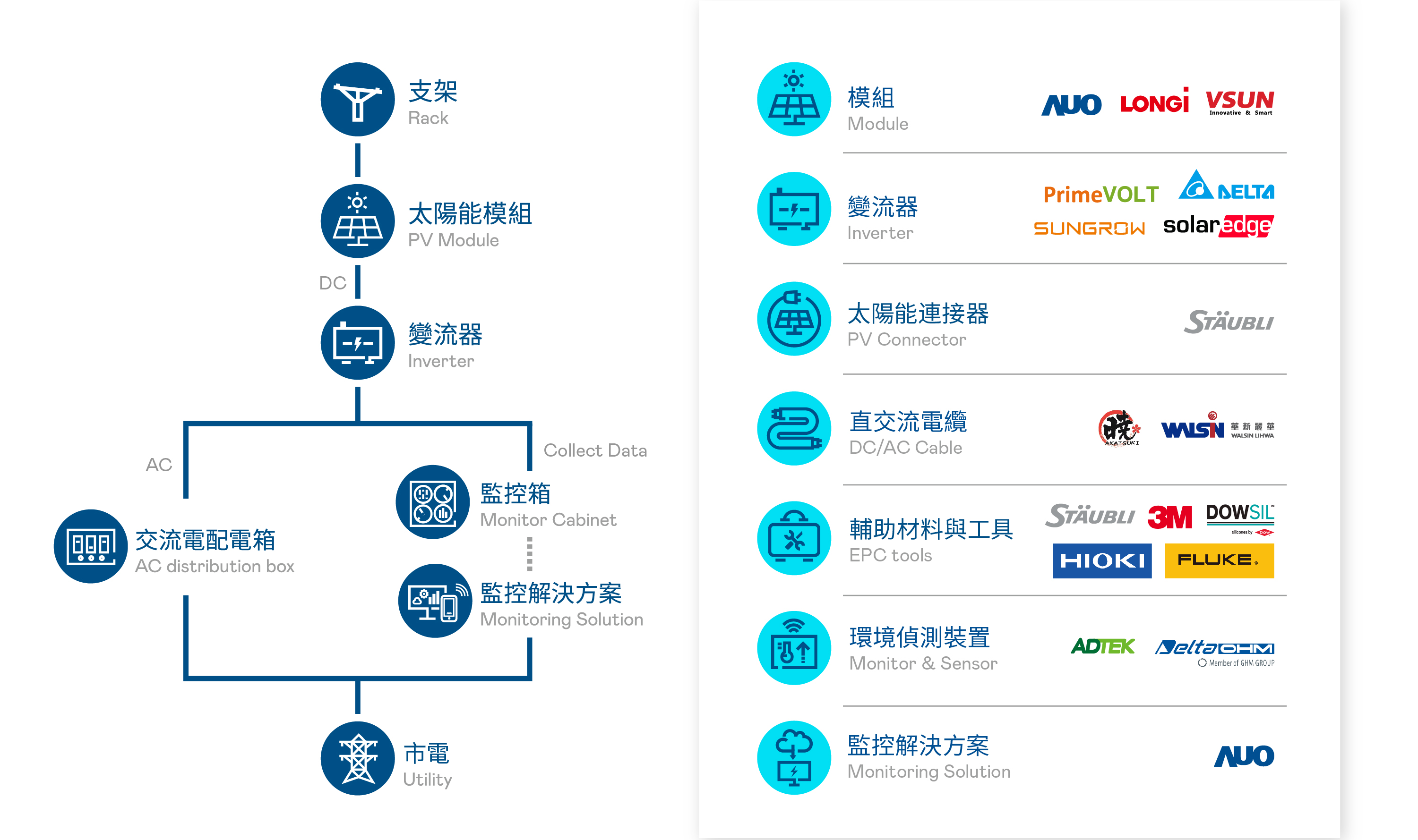 In "one-stop shopping" services, AUO has cooperated with well-known partners to integrate high-performance solar modules, monitoring software and hardware solutions, inverters, connectors, cables, component products for solar power plants, such as environmental monitoring devices and related auxiliary materials and tools, all providing customers with online and offline services.